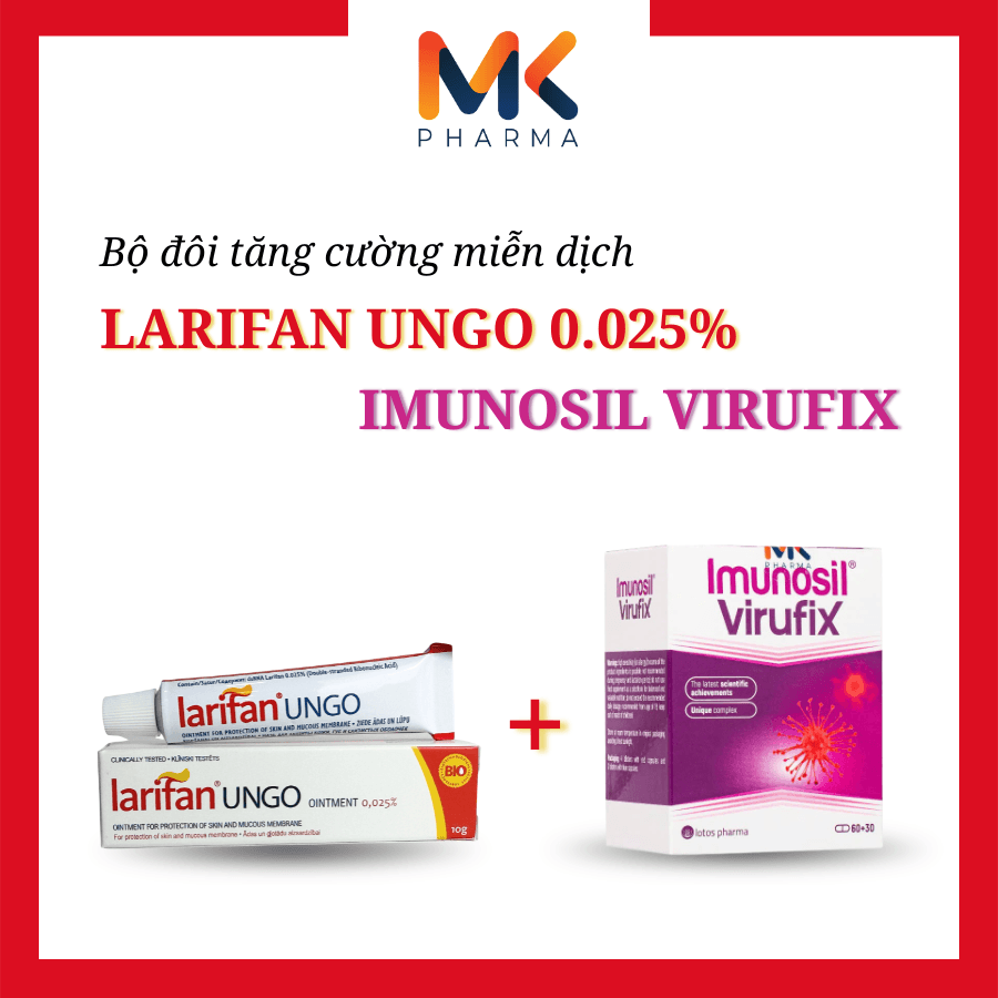 Trong bối cảnh môi trường sống ngày càng tiềm ẩn nhiều nguy cơ, việc tăng cường hệ miễn dịch và bảo vệ cơ thể khỏi sự tấn công của virus là ưu tiên hàng đầu. Bộ đôi sản phẩm Larifan Ungo 0.025% và Imunosil Virufix mang đến giải pháp kết hợp toàn diện, giúp chăm sóc sức khỏe chủ động từ bên ngoài lẫn bên trong.